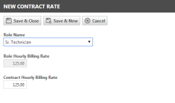 Für den vertragsmäßigen Stundensatz wird standardmäßig der schreibgeschützte Standardsatz für die ausgewählte Rolle verwendet. Um die Rolle für einen Individualvertrag, Vorauszahlungsvertrag oder Pauschalvertrag zu modifizieren, gehen Sie wie folgt vor: