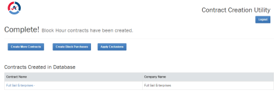 The last page of the Contract Creation Utility lists all the contracts that have been created. On this page, you can apply exclusions to the contracts you just created, add block, retainer and ticket purchases, open and review the contracts you created, or return to the first page to create more contracts.