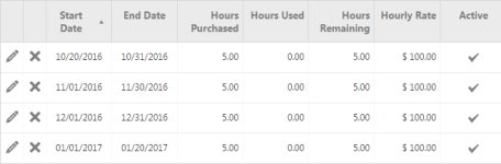 On this page, you set up the hourly rates for the contract. You can add rates to all contracts, or add and remove rates from individual contracts.