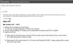 In der KnowledgeBase wurde bisher unser HTML-Editor genutzt, damit Benutzer individuelle Stilelemente und Bilder im Inhaltsbereich verwenden konnten. Autotask nutzt ab sofort den neueren Rich-Text-Editor, und die benutzerdefinierte HTML-Formatierung wird nicht länger unterstützt. Alle neuen Inhalte werden im Rich-Text-Editor erstellt. Siehe Der Rich-Text-Editor.