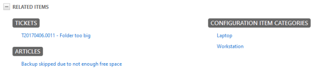 Das Ticket erscheint nicht länger in der Liste der zugehörigen Tickets. Im Abschnitt KnowledgeBase auf der Detailseite des gelöschten Tickets wird nicht länger ein Link zum Inhalt angezeigt.