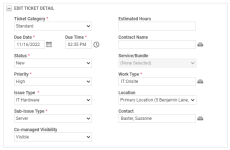 | Feld „Ticketdetails“ | Im Abschnitt Ticketdetails bearbeiten sehen Sie alle Felder, die auf dem Ticket sichtbar sind, plus alle Felder, die für die Ticketrubrik erforderlich sind (sowohl sichtbar als auch nicht sichtbar). Die Optionen für Auswahllisten werden ebenfalls anhand der Ticketrubrik festgelegt. |