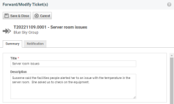 | Felder für Benachrichtigung | Um Mitarbeiter und Kontakte zu benachrichtigen, klicken Sie auf die Registerkarte Benachrichtigung, wählen Sie die Empfänger und füllen Sie die Felder für die Benachrichtigung aus. Siehe Eine manuelle Benachrichtigung erstellen. HINWEIS Wenn Sie mehrere Tickets auf einmal weiterleiten/ändern, sind die Kontaktauswahl und die Option „Alle Tickt-Mitwirkenden auswählen“ nicht für die Benachrichtigung verfügbar. Klicken Sie auf Standardeinstellungen bearbeiten, um die Standardeinstellungen für Benachrichtigungen zu ändern. Siehe Standardeinstellungen für Benachrichtigungen konfigurieren. |