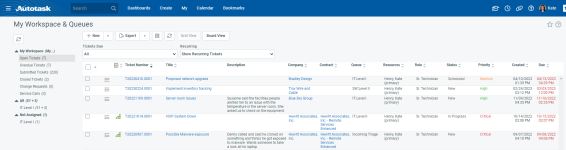 Alle zeigt jede Ihrer zugewiesenen Queues an, auch wenn sie leer sind, und bietet Zugriff auf alle Tickets in jeder Queue. Tickets sind nicht auf Ihnen zugewiesene Tickets beschränkt. Wenn Sie auf einen dieser Menüpunkte klicken, wird eine Tabelle mit Funktionen geöffnet, die mit der Seite Ticketsuche identisch sind. Eine Beschreibung der Schaltflächenleiste und der Kontextmenüoptionen finden Sie unter Tickets suchen und verwalten. Darüber hinaus werden auf dieser Seite der dynamische Datumsfilter Fällige Tickets und der Filter Ticketserien anzeigen/ausblenden angezeigt. |