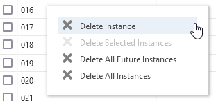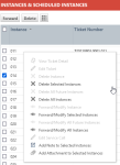 Wählen Sie mindestens eine erstellte oder geplante Instanz aus, um die Schaltfläche Löschen zu aktivieren. Sie können Instanzen und geplante Instanzen mit Fälligkeitsdaten in der Vergangenheit oder in der Zukunft löschen, solange für das Ticket noch kein Arbeitsaufwand erfasst wurde. Instanzen mit einem Fälligkeitsdatum in den zukünftigen und geplanten Instanzen können neu erstellt werden, jedoch können letzte Instanzen nicht neu erstellt werden. |