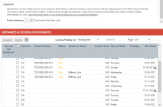 - Geplante Instanzen enthalten eine Instanznummer und ein Fälligkeitsdatum, jedoch wurde das Ticket noch nicht erstellt. Das Ticket für die Instanz wird für die Anzahl der Tage erstellt, die Sie im Erstellung-Abschnitt auf der Registerkarte Serie angegeben haben.