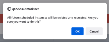 - Um zukünftig erstellte Instanzen zu aktualisieren, müssen Sie diese zunächst löschen und dann das Enddatum verlängern oder die Anzahl der Instanzen um die gelöschte Anzahl erhöhen. Sie erhalten eine Nachricht, dass alle zukünftigen Instanzen gelöscht und mit den aktualisierten Informationen neu erstellt werden.