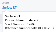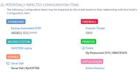 | Potenziell betroffene Geräte | Diese Komponente zeigt Geräte an, die mit dem Gerät oder dem Hauptgerät des Tickets verbunden sind.  Wenn er in der Ticketrubrik sichtbar gemacht wurde, wird das mit dem Ticket verbundene Hauptgerät zuerst aufgelistet und beinhaltet Artikelname, Referenzname, Referenznummer und Seriennummer (falls verfügbar). Alle übergeordneten oder untergeordneten Geräte des Hauptgeräts werden nachfolgend aufgelistet (nach Geräterubrik gruppiert). Wenn das Hauptgerät über ein übergeordnetes Gerät verfügt, wird der Artikelname des übergeordneten Geräts über dem Artikelnamen des Hauptgeräts aufgelistet. Auf Ticketseiten heißt dieser Abschnitt Potenziell betroffene Geräte, und Geräte, die mit dem Gerät des Tickets verbunden sind, werden hier aufgeführt. Siehe Beziehungen zwischen Geräte verwalten (die Registerkarte „zugehörige Geräte“). |