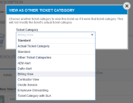 - Wählen Sie optional eine andere Ticketrubrik aus. Die Ticketrubrik bestimmt das Layout des Tickets, die verfügbaren Abschnitte, Felder und Optionen für Auswahllisten und sollte immer ausgewählt werden, bevor andere Felder ausgefüllt werden. Siehe Einführung in Rubriken.