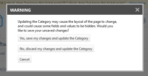 - Wenn Sie auf Nein, meine Änderungen verwerfen klicken, werden die nicht gespeicherten Änderungen auf der Seite verworfen. Dann wird die Ticketrubrik angewandt. Wenn Sie eine Formularvorlage ausgewählt haben, wird die Formularvorlage angewandt, einschließlich der neuen Ticketrubrik.
