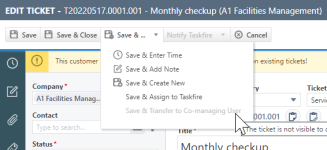 | Speichern & an Co-Management übertragen (nur bearbeiten) | Diese Schaltfläche wird nur in der Symbolleiste von Mitarbeitern mit einem Zugriffsrecht angezeigt, das nicht vom Typ „Co-managed“ ist. Wenn Sie darauf klicken, wird das Ticket gespeichert und an den Co-managed Helpdesk weitergeleitet und die Mitarbeiter aus dem Feld Verantwortlicher Mitarbeiter in das Feld Zusätzliche(r) Mitarbeiter verschoben. Zudem wird das Feld Co-Management zugewiesen auf Wahr festgelegt. Wenn keine Queue ausgewählt wird, wird das Ticket dem verantwortlichen Co-managing Mitarbeiter der Firma zugewiesen. |