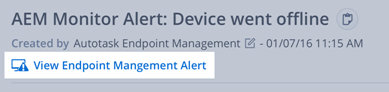 Dieser Link wird nur auf Tickets mit der Ticketart „Warnung“ angezeigt, die von der Datto RMM-Integration erstellt wurden. Wenn Sie auf den Link klicken, wird die ursprüngliche Warnung in Datto RMM geöffnet. Siehe Auf die mit dem Ticket verbundene Datto RMM-Warnung zugreifen. |