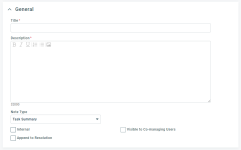 | Notiztyp | Das Feld Notiztyp ist standardmäßig Zusammenfassung der Aufgabe. Sie können einen anderen Notiztyp aus der Dropdown-Liste auswählen. Alle aktiven Notiztypen der Kategorie Aufgabe sind verfügbar, plus die aktuelle Auswahl, selbst wenn diese inaktiv ist. Wenn Sie einen anderen Notiztyp auswählen, müssen Sie beachten, dass dieser eventuell eine andere Option zum Veröffentlichen haben. Überprüfen Sie die Einstellung des Kontrollkästchens Nur intern. Sonderfälle: