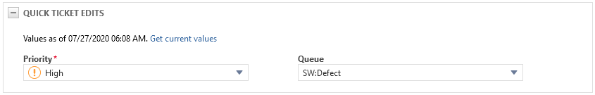 WICHTIG Felder, die nicht sichtbar sind, können nicht validiert werden. Wenn der Abschnitt QuickEdits für Ticket reduziert bleibt, können Sie die Notiz oder den Zeiteintrag speichern, ohne erforderliche Felder auszufüllen. Sie können die Ticketrubrik ändern, um sicherzustellen, dass der Abschnitt erweitert wird, wenn der Zeiteintrag oder die Notiz zum ersten Mal geöffnet wird und dass die erforderlichen Felder ausgefüllt werden. Siehe QuickEdit-Felder für Zeiteinträge/Notizen.