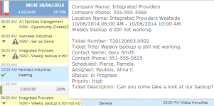 TIPP Wenn in Ihrem Kalender (jedoch nicht im Einsatzkalender) ein Ticket oder eine Aufgabe in einem Servicetermin aufgelistet ist und abgeschlossen wurde, wird dies durchgestrichen angezeigt.