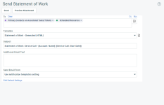 Zusätzlicher E-Mail-TextDieses Feld erscheint in Objekten, die E-Mail-Benachrichtigungen beim Erstellen oder Bearbeiten unterstützen. Es speichert zusätzlichen Text, der in der Benachrichtigungsmail erscheinen soll. Geben Sie Text ein, der in der Benachrichtigungsmail über dem Anhang oder dem standardmäßig aus der Vorlage übernommenen Text im Hauptteil erscheinen soll. Es hängt vom Objekt ab, ob der von Ihnen hier eingegebene Text in Autotask gespeichert wird oder nicht. Wenn der Text gespeichert wird, kann er als eine Systemnotiz angezeigt werden. |