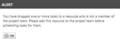 HINWEIS Wenn Sie versuchen, eine Aufgabe auf den Zeitplan eines Mitarbeiters zu ziehen, der kein Mitglied des Projektteams ist, wird eine Nachricht mit der Aufforderung angezeigt, den Mitarbeiter zum Projektteam hinzuzufügen, bevor Sie diesen für die Aufgabe einplanen.