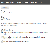 Sobald Sie die Aufgabe im neuen Zeitfenster loslassen, werden eine oder mehrere Meldungen nacheinander angezeigt. Die Meldungen hängen von verschiedenen Faktoren ab: Ob Sie die Aufgabe auf einen existierenden Servicetermin oder ein leeres Zeitfenster ziehen, ob das Zeitfenster auf dem Zeitplan eines Mitarbeiters liegt, dem diese Aufgabe bereits zugewiesen wurde, oder ob Sie die Aufgabe auf den gleichen Servicetermin im Kalender eines anderen Mitarbeiters ziehen.