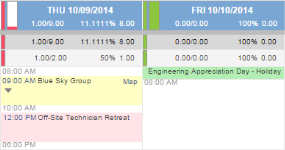 Ihr Autotask-Kalender und der Einsatzkalender verwenden Farbkodierung und Auslastungsmetriken, damit Sie ganz einfach verschiedene Arten von Termineinträgen unterscheiden können und leicht erkennen können, wer verfügbar ist. Die nachfolgenden Diagramme helfen Ihnen dabei, alles zu verstehen.