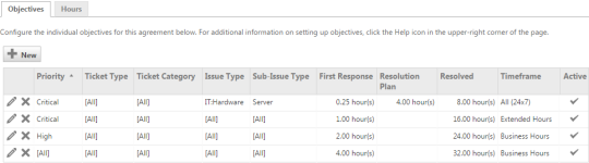 - Den Zeitrahmen (Geschäftszeiten, verlängerte Geschäftszeiten oder Alle (24x7)), wann die SLA-Uhr läuft.