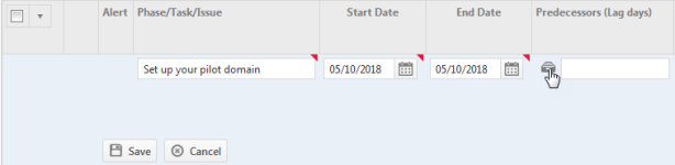 Wenn Phasen oder andere Aufgaben oder Projektprobleme vor Beginn dieser Arbeiten abgeschlossen werden sollten, klicken Sie auf die Datenauswahl. Details zur Auswahl von Vorgängeraufgaben finden Sie unter Vorgänger- und Nachfolgeaufgaben. |