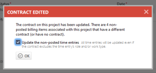 - Auf Projektebene können Sie einen neuen Vertrag anwenden, aber Rollen und Tätigkeitsarten werden nicht geändert, auch wenn sie durch den neuen Vertrag ausgeschlossen sind.