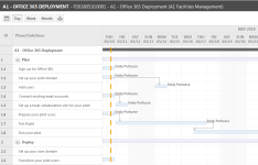 - In den Das Gantt-Diagramm (Zeitachsenansicht) verbindet eine dünne Linie verlinkte Einträge miteinander. Ein Pfeil an einem Ende zeigt die Richtung der Abhängigkeit an.