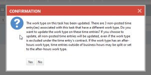 - Auf Aufgabenebene kann das Aktualisieren der Tätigkeitsart nicht nur Modifikatoren für Abrechnungsrollen ändern, sondern auch, wie nicht gebuchte Zeiteinträge verarbeitet werden. Wenn Sie eine Tätigkeitsart auswählen, die eine zugehörige Feierabend-Tätigkeitsart hat, und die Zeiteingabe teilweise oder ganz außerhalb der normalen Geschäftszeiten liegt, wird die Feierabend-Tätigkeitsart angewendet.