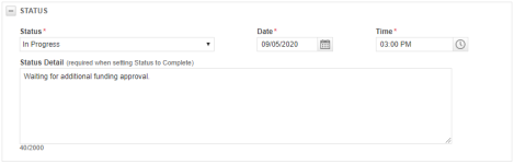 Datums- und Uhrzeitfelder | Die Felder für Datum und Uhrzeit übernehmen standardmäßig das aktuelle Datum und die aktuelle Uhrzeit, wenn Sie einen anderen Status auswählen. Sie können dies bei Bedarf ändern. Das Statusdatum erscheint in der Projektübersicht. Die Uhrzeit wird verwendet, um sicherzustellen, dass das Datum in allen Zeitzonen korrekt ist. |