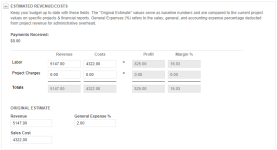 Beim Erstellen oder Bearbeiten des Projekts können Sie Ihre finanziellen Erwartungen für das Projekt in die Felder Umsatz, Vertriebskosten und Gemeinkosten % eingeben. Die Werte unter „Ursprünglich geschätzt“ dienen als Baseline und werden mit den tatsächlichen Zahlen verglichen, die Sie in die Felder Umsatz und Kosten für Arbeitsaufwand und Projektwarenposten eingeben können. Summen, Gewinn und Marge % werden automatisch berechnet.