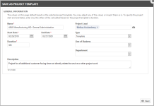 Der Assistent Als Projektvorlage speichern beginnt mit der Seite „Allgemeine Informationen“. Diese Seite enthält die Felder Allgemeine Informationen die aus dem ursprünglichen Projekt kopiert oder aus der Vorlage in das neue Projekt kopiert wurden.