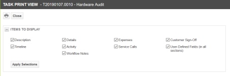 | Druckansicht | Klicken Sie darauf, um eine Druckansicht der Aufgabe zu öffnen, die für den Druckvorgang formatiert wurde. Aktivieren oder deaktivieren Sie Kontrollkästchen, um auszuwählen, welche Art von Informationen Sie ausdrucken möchten: Beschreibung, Zeitleiste, Details, Aktivität, Workflow-Notizen, Spesen, Servicetermine, Kundenabzeichnung, benutzerdefinierte Felder. Klicken Sie auf Auswahl anwenden, um die aktualisierte Druckansicht anzuzeigen. HINWEIS Die Kundenabzeichnung bietet eine Unterschriftzeile, damit der Kunde abgeschlossene Arbeiten zu Kenntnis nehmen und genehmigen kann. Nachdem Sie die Informationen ausgewählt haben, die Sie beinhalten möchten, klicken Sie in der Druckansicht auf das Symbol Drucken, um die Informationen an Ihren Drucker zu senden. Beziehen Sie sich außerdem auf Drucken eines Tickets. |
