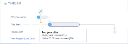 Jede Zeitleiste hat einen oder mehrere Balken, welche die aktuelle Aufgabe und gegebenenfalls abhängige Aufgaben (Vorgänger- oder Nachfolgeaufgaben) darstellen. Die Farbe des Balkens für die aktuelle Aufgabe ist hell-blaugrau, es sei denn, die Aufgabe ist überfällig (das aktuelle Datum liegt nach dem Enddatum der Aufgabe). In diesem Fall ist die Farbe rot-grau. Alle Vorgänger- und Nachfolgeaufgaben werden in einem Balken gruppiert. Der Vorgängerbalken ist über und links vom Balken für die aktuelle Aufgabe, der Nachfolgebalken ist darunter und rechts. Abhängige Aufgaben sind ebenfalls blaugrau, es sei denn, eine oder mehrere Aufgaben, die vom Balken repräsentiert werden, sind überfällig. In diesem Fall ist der Balken rot-grau. Ein einheitlich blauer oder roter Bereich in einem Balken zeigt die Anzahl der für die Aufgabe(n) geleisteten Arbeitsstunden relativ zum geschätzten Gesamtzeitaufwand für die Aufgabe(n) an, einschließlich der voraussichtlichen Abweichung. Bei abgeschlossenen Aufgaben ist der gesamte Balken entweder blau oder rot. Fahren Sie mit der Maus über einen Aufgabenbalken oder den Balken einer abhängigen Aufgabe, um den Namen der Aufgabe, die Anzahl der geleisteten Arbeitsstunden der gesamten Aufgabenstunden (die gesamte Aufgabenstunden sind der geschätzte Zeitaufwand plus die voraussichtliche Abweichung) sowie das Start- und Enddatum anzuzeigen. Wenn mehr als eine Vorgänger- oder Nachfolgeaufgabe vorhanden ist, wird jeder Aufgabenname zusammen mit dem frühesten Datum für das Startdatum und dem spätesten Datum für das Enddatum der Aufgaben aufgelistet. Klicken Sie auf einen Vorgänger- oder Nachfolgebalken, um eine Tabellenliste zum Nachforschen für alle mit diesem Balken repräsentierten Aufgaben zu öffnen. Ein einheitlich blauer oder roter Bereich im Balken zeigt die Anzahl der für die Aufgabe geleisteten Arbeitsstunden relativ zum geschätzten Zeitaufwand insgesamt für die Aufgabe an. Bei abgeschlossenen Aufgaben ist der gesamte Balken entweder blau oder rot. |