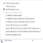 Mit diesen Optionen können Sie die ausgewählten Bestandsartikel ganz einfach bestellen, indem Sie sie zu einer vorhandenen Bestellung hinzufügen. Optional wird die Anzahl auf die Differenz zwischen dem Lagerbestand und dem Minimum oder Maximum für jeden Artikel gesetzt. Die Standardanzahl wird mindestens eine (1) sein. Alle vorhandenen Bestellungen mit dem StatusNeustehen zur Auswahl zur Verfügung. Zusätzliche Informationen zum Fertigstellen einer Bestellung finden Sie unter Eine Bestellung hinzufügen oder bearbeiten. |