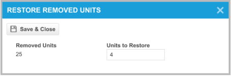 Diese Option wird nur dann angezeigt, wenn ein Lagerartikel über einen Artikel ohne Seriennummer verfügt und die Anzahl der entfernten Einheiten größer als 0 ist. Dadurch wird das Dialogfeld Entfernte Einheiten wiederherstellen geöffnet. Wenn Sie nicht berechtigt sind, Bestandsartikel zu bearbeiten, wird diese Option ausgeblendet. |