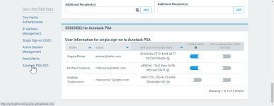 - Scrollen Sie im Partner-Portal > Admin > Sicherheitseinstellungen zu Autotask SSO. Alle Mitarbeiter, die ein Benutzerkonto im Partner Portal haben, sind hier aufgelistet.