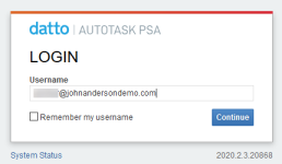 - Geben Sie Ihren Benutzernamen (nicht Ihre E-Mail-Adresse) für Autotask ein und klicken Sie auf Anmelden.