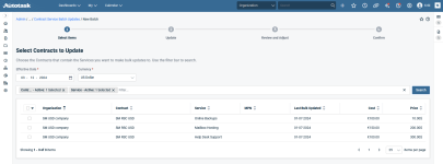 Auf der Seite Services aktualisieren können Sie die Servicekosten, den Preis oder die Kosten und Preise in den ausgewählten Verträgen aktualisieren. Kosten und Preise können aktualisiert werden durch