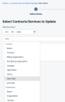 Auf der ersten Seite des Assistenten wählen Sie die Services aus, die Teil des Aktualisierungsbatches sein sollen. Um die Liste der zu aktualisierenden Dienste einzugrenzen, können Sie die Liste der Dienste nach Dienst, Vertrag und Firma filtern. Sie können Filterkriterien auf die folgenden Felder anwenden: