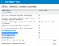 Wenn Sie sich nicht sicher sind, welche internen Zeitcodes in den Freizeitrichtlinien verwendet werden, gehen Sie zu Linkes Navigationsmenü > Verwaltung > Verwaltungskategorien > Funktionen und Einstellungen > Anwendungsweite (gemeinsame) Funktionen > Systemeinstellungen > Arbeitszeitblätter und suchen Sie nach den Einstellungen, die mit Aktivieren beginnen.