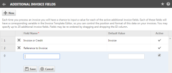| Löschen | Fordert Sie zum Bestätigen auf und löscht dann die Zeile aus der Tabelle. HINWEIS Sie können ein Feld nicht löschen, wenn damit Daten in bereits bearbeiteten Rechnungen verbunden sind. Alternativ können Sie es deaktivieren. |