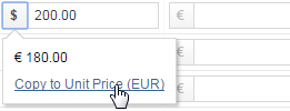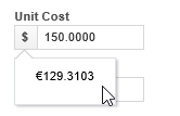 - Wenn Sie auf den Währungsindikator der ausgewählten Kundenwährung klicken, wird im Dialogfeld zur Währungsumrechnung der Betrag in Ihrer internen Währung angezeigt: Angezeigter Wert = Feldwert x Wechselkurs für die ausgewählte Kundenwährung.