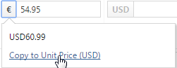 - Um einen Hinweis zu erhalten, wie der Preis basierend auf dem Wechselkurs aussehen würde, klicken Sie auf das Währungssymbol für den internen Einzelpreis. Um den Preis zu akzeptieren, klicken Sie auf den Link In „Stundensatz (...)“ kopieren.