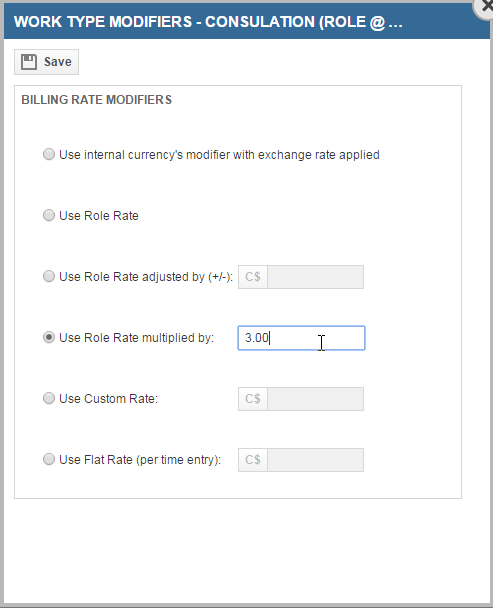Alle direkt abrechenbaren Zeiteinträge sind das Produkt eines Stundensatzes und eines Modifikators für die Tätigkeitsart. Entweder haben Sie bereits Modifikatoren für Tätigkeitsarten bei Arbeitsaufwand in Ihrer internen Währung eingerichtet oder werden dies tun. Detaillierte Informationen finden Sie unter Tätigkeitsarten.