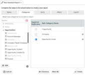 | Wählen Sie die Kategorie aus und klicken Sie dann auf Hinzufügen, doppelklicken Sie oder verschieben Sie sie per Drag & Drop in den rechten Bereich, um sie dem Bericht hinzuzufügen. Sobald Sie mit der Auswahl der Kategorien beginnen, werden andere Kategorien nicht mehr verfügbar sein (ausgegraut). Dies geschieht, wenn es keine Gemeinsamkeit oder direkte Verbindung (kein „Join“) zwischen der bereits ausgewählten Unterkategorie und den ausgegrauten Unterkategorien gibt. | |