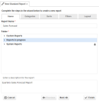 - Die Option Standardbericht ermöglicht erweiterte Formatierungsoptionen, die in Schnellberichten nicht verfügbar sind. Sie können Ihren Bericht über den Assistenten für neue Berichte erstellen. Sobald Sie auf die Schaltfläche Fertigstellen klicken, wird die Seite für den erweiterten Editor geöffnet. Verwenden Sie diese Option für komplexere Berichte oder wenn Sie erweiterte Formatierungsoptionen verwenden möchten.