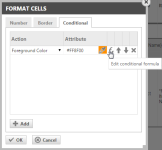 Damit können Sie ein Zahlenformat und einen Randstil sowie bedingte Formatierung auf eine Zelle anwenden. Die bedingte Formatierung ist bei Schnellberichten nicht verfügbar. Um bedingte Formatierung anzuwenden, wählen Sie die Zelle aus und klicken Sie auf das Symbol Zellen formatieren. Klicken Sie dann auf die Registerkarte Bedingung. Wenn keine Bedingungen präsent sind, klicken Sie auf Hinzufügen. Klicken Sie auf das Symbol Bedingungsformel bearbeiten. Das Fenster für den Formeleditor wird geöffnet. Um bedingte Formatierung basierend auf dem Zellenwert der ausgewählten Zelle anzuwenden, klicken Sie auf die Schaltfläche „+“ für den Zellenwert und geben Sie einen Operator (=, >, <) sowie einen Wert ein. Sie können selbstverständlich auch ganz normal eine Formel eingeben. Siehe LiveReports-Formeln. TIPP Verwenden Sie für die beste Leistung die Schaltfläche „+“ für Zellenwerte. TIPP Dieses Symbol |