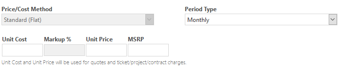 | Art des Zeitraums | Die Art des Zeitraums bestimmt die Abrechnungshäufigkeit für den Artikel. Wenn die Abrechnungsart „Pro Kontakt“ oder „Pro Gerät“ ist, wird die Art des Zeitraums auf „Monatlich“ gesetzt und kann nicht bearbeitet werden. |
