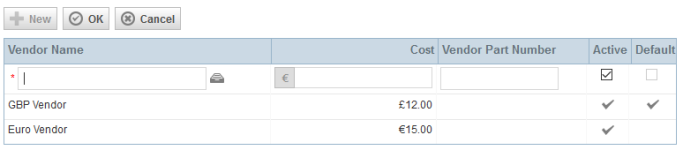 - Wenn für Ihre Datenbank Multi-Währung aktiviert ist, zeigt das Feld Kosten den Währungsindikator an. Die Standardeinstellung ist Ihre interne Währung. Wenn Sie eine Lieferantenfirma auswählen, die mit einer anderen Währung verbunden ist, wird der Indikator zur Währung des Lieferanten geändert. Es wird davon ausgegangen, dass der von Ihnen im Feld „Kosten“ eingegebene Wert in der Währung des Lieferanten ist.