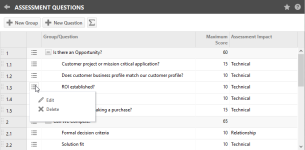 Sowohl Gruppen als auch Fragen können gelöscht werden, indem Sie im Popup-Bestätigungsfenster auf „OK“ klicken. Das Löschen der Gruppen bedeutet, dass alle Fragen in der Gruppe ebenfalls gelöscht werden. Bestehende Punktzahlen für die Verkaufschancenanalyse werden erst dann für individuelle Verkaufschancen neu berechnet, wenn Sie auf der Registerkarte „Analyse“ der Seite „Verkaufschancendetails“ einen Speichervorgang durchführen. Die Zeile „Gesamtanalyse“ kann nicht gelöscht werden. |